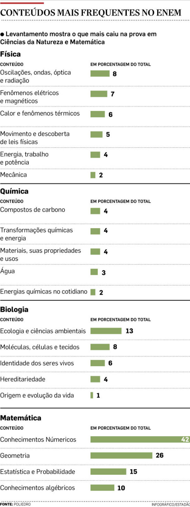 SÃO PAULO - Elas são as disciplinas mais temidas pelos alunos e as que têm menor porcentual de acertos no Exame Nacional do Ensino Médio (Enem). Mas um levantamento feito pelo Sistema de Ensino Poliedro identificou quais foram os conteúdos mais cobrados nas provas de Ciências da Natureza (que engloba Química, Física e Biologia) e Matemática nos últimos seis anos para que o aluno possa reforçar os estudos para a prova, que acontece em 5 e 6 de novembro.