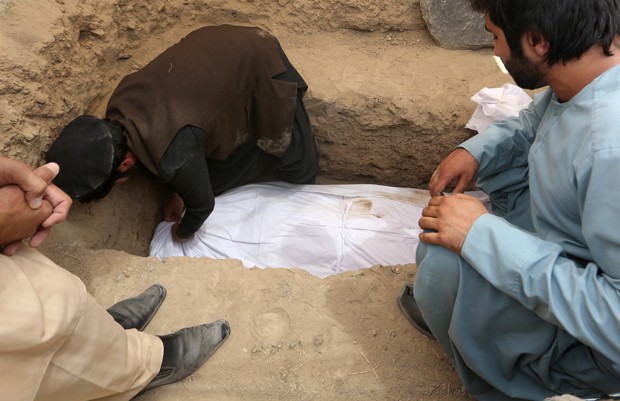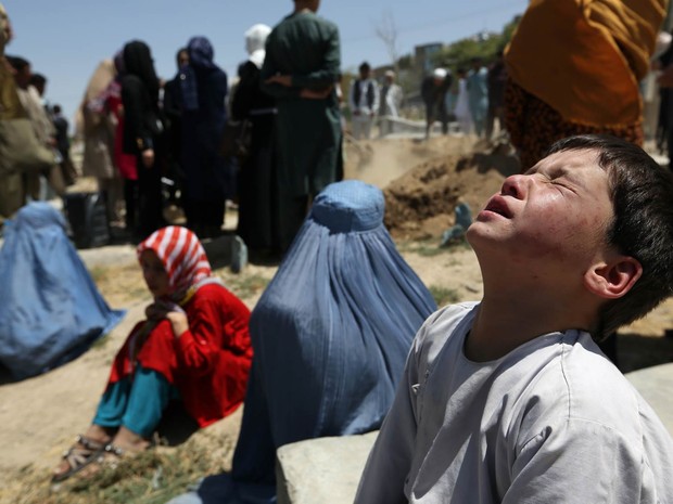 Menino chora durante o funeral de sua irmã Zarah, jovem afegã de 14 anos que estava grávida e foi mo Foto: Rahmat Gul/AP
