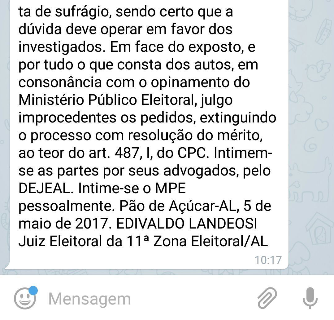 O juiz Edivaldo Landeosi, da 11ª Zona Eleitoral, julgou improcedente e extinguiu o processo impetrado pelo então candidato a prefeito Dr. Eraldinho (PSD), da Coligação Por Uma Nova Pão de Açúcar, em outubro de 2016.